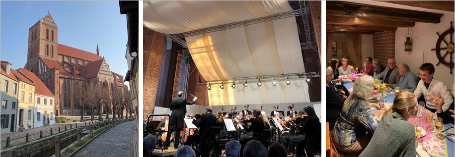 So starteten wir am Samstagmorgen, 06.04.2019, kurz nach neun vom Busbahnhof in Hannover Richtung Wismar, gut verabschiedet von Frau Tobschall. Das Wetter hieß gut zu werden, und der Verkehr lief trotz Ferienbeginn in Niedersachsen weitestgehend glatt. Gegen 13 Uhr hatte uns unser Busfahrer bis zum Hotel „Alter Speicher“ in der Altstadt von Wismar bestens kutschiert, und ein entspannter Nachmittag lag vor uns. Wir konnten auf Entdeckertour gehen. Das bot sich bei dem wunderschönen Sonnenschein an – und so trafen wir in dieser Freizeit den einen oder anderen, der uns bekannt vorkam – Orchestermitglieder der RPH.