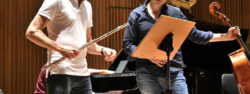 Mitglieder der NDR Radiophilharmonie Christoph Renz (Flöte) und Nikolai Schneider (Violoncello) proben vor Mitgliedern des Freundeskreises: Kammermusik Live! 2023