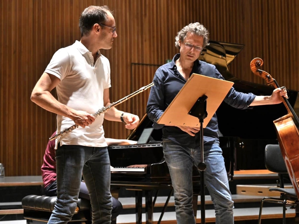 Mitglieder der NDR Radiophilharmonie Christoph Renz (Flöte) und Nikolai Schneider (Violoncello) proben vor Mitgliedern des Freundeskreises: Kammermusik Live! 2023