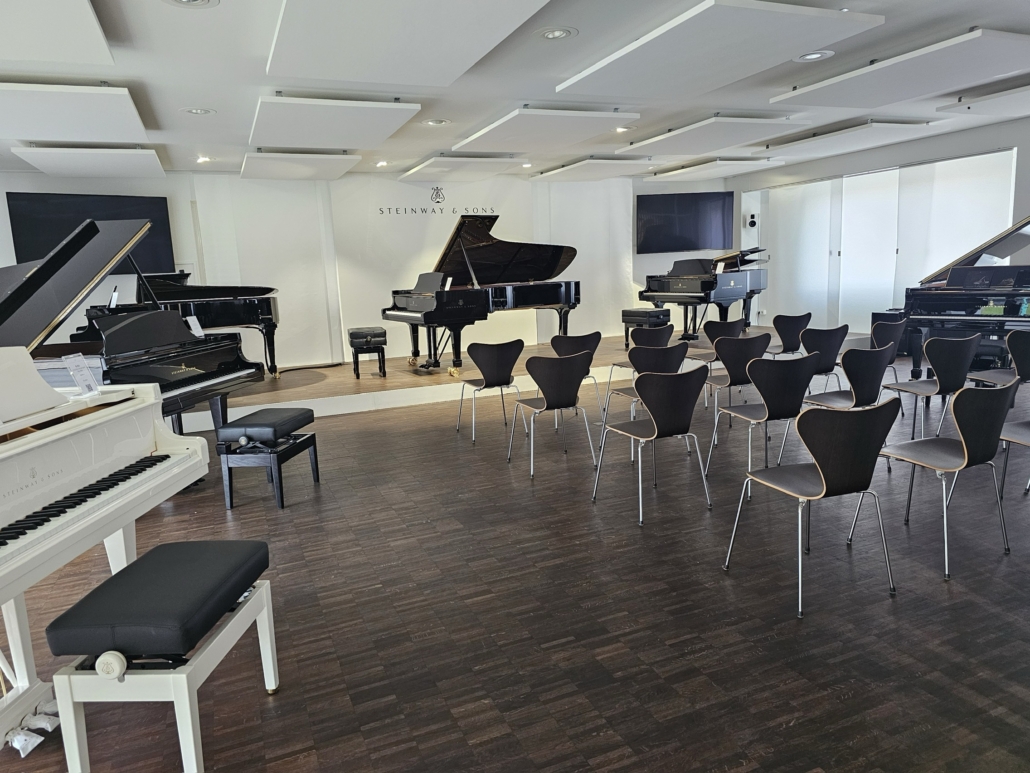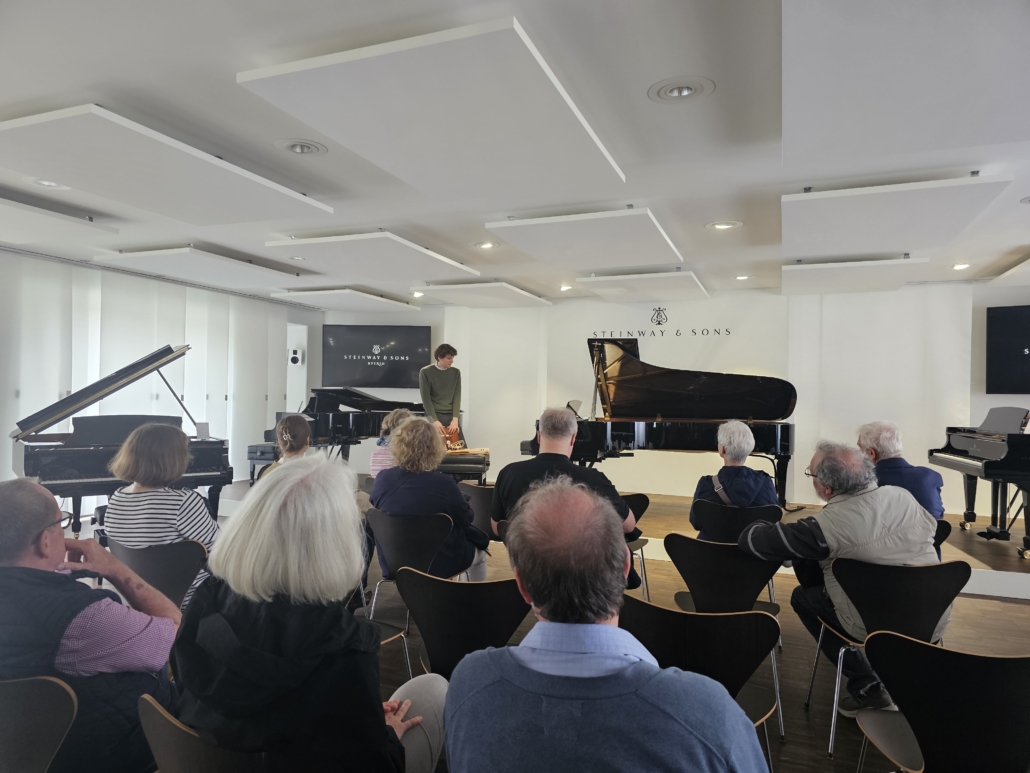 Im Anschluss an die Werksführung konnten wir Herrn Thieles Ausführungen im Verkaufsraum der Firma lauschen, wo er uns die neueste Technik des Selbstspielsystems Spirio an unterschiedlichen Flügeln demonstrierte.