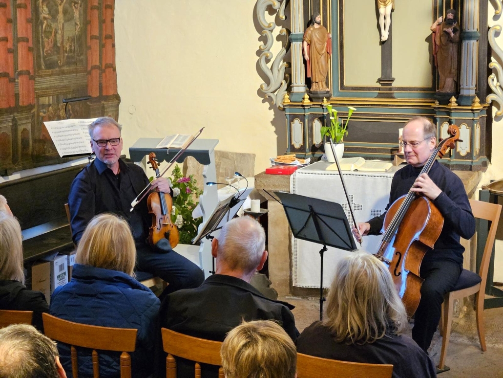 Mitglieder der NDR Radiophilharmonie Laurent Plettner (Geige), Sebastian Maas (Cello) und Jan Hendrik Rübel (Cello) haben das Publikum in Arnum begeistert (16.4.24)