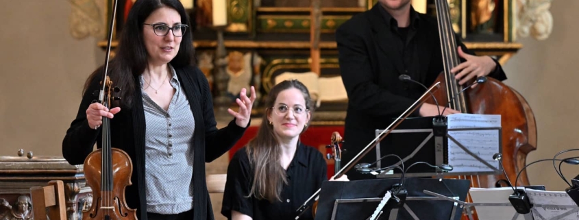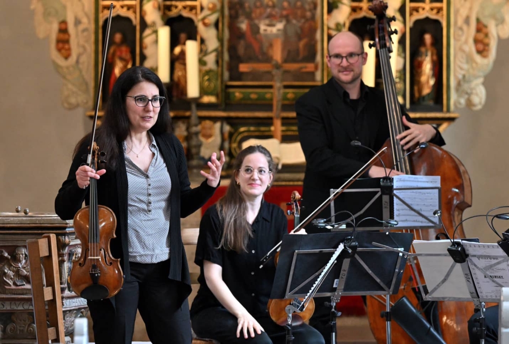 Kristina Altunjan, Mitglied der NDR Radiophilharmonie erklärt das Konzept des Musik ganz Nah in 2025: Heimland; es hat in der St. Vitus Kirche, Wilkenburg am 7. Mai einem sonnigen Frühlingstag stattgefunden.
