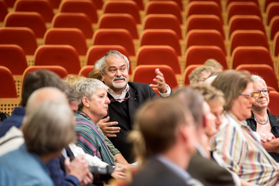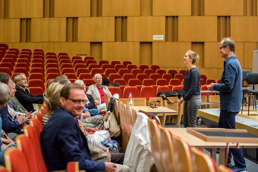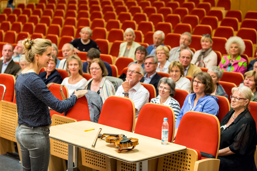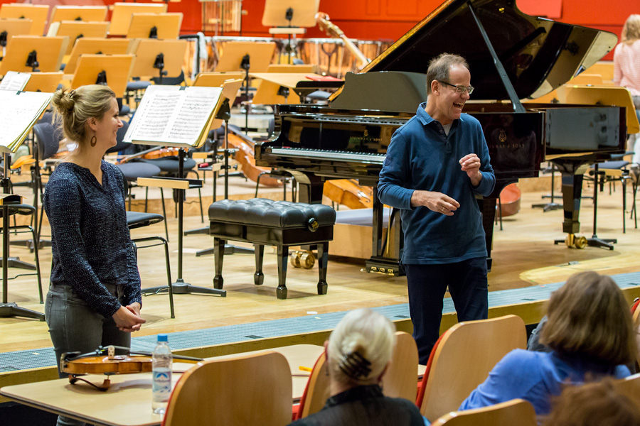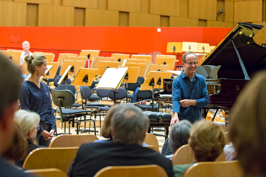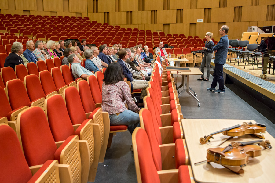 Am 23.8. 2017 waren die Freunde zum ersten Mal bei einer Probe der NDR Radiophilharmonie zu Gast. Unter der Leitung von Andrew Manze und des Solisten Alexandre Tharaud wurde Mozarts „Jeunehomme“ Klavierkonzert KV 271 einstudiert und die Besucher erlebten dabei die erste gemeinsame Arbeit der Musiker mit diesem Werk live und hautnah. Danach gab es Gelegenheit zu allen Fragen, die sich bei vielen der Musikliebhaber über Jahre der Konzertbesuche angesammelt hatten. Dem Wissensdurst der Freunde innerhalb von 30 Minuten möglichst gerecht zu werden war das erklärte Ziel von Sebastian Maas (Violoncello) und Sophie Pantzier (Violine) und bereitete den beiden großes Vergnügen. Denn es sind die erstaunlichsten Fragen, die sich beim Belauschen und Beobachten eines so großen Klangkörpers stellen und zu erklären sind.
